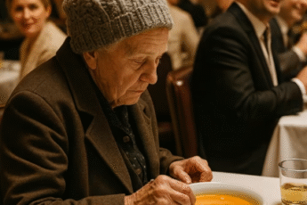An elderly woman, dressed in worn and simple clothes, entered an elegant restaurant. At the door, the