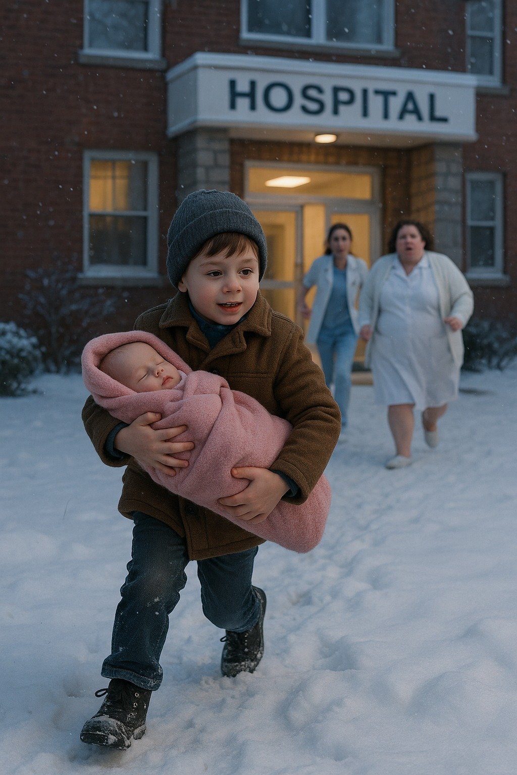 But the boy didn’t even turn around. He ran down the hallway, holding his sister tightly to his chest. The nurse rushed after him, called security, and the father sprinted behind them. A full-blown alarm filled the corridor.