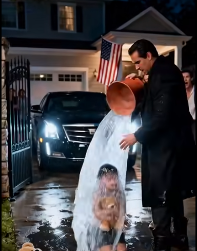 The jacket of his dark suit moved slightly in the wind as he moved forward. His face was sharp, his eyes still stunned by the sight of a little girl drenched in cold water, shivering in the middle of the courtyard. Alejandro slowly removed his coat and placed it over Sofia’s shoulders. The small body underneath shivered under the warmth that still lingered in the fabric. Sofia looked up, her tear-stained eyes shining with a fragile hope. Her small hand clutched the hem of his coat as if afraid it might disappear.