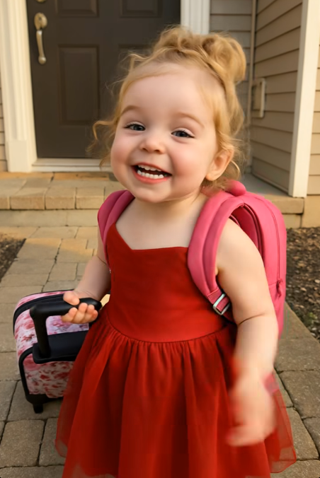 This evening, as soon as I stepped into the yard, I saw a strange sight: my four-year-old daughter was standing right at the doorstep, as if she had been guarding it and waiting for me. She was wearing her little pink backpack, and next to her was the small rolling suitcase we had bought for our trips to the seaside.
