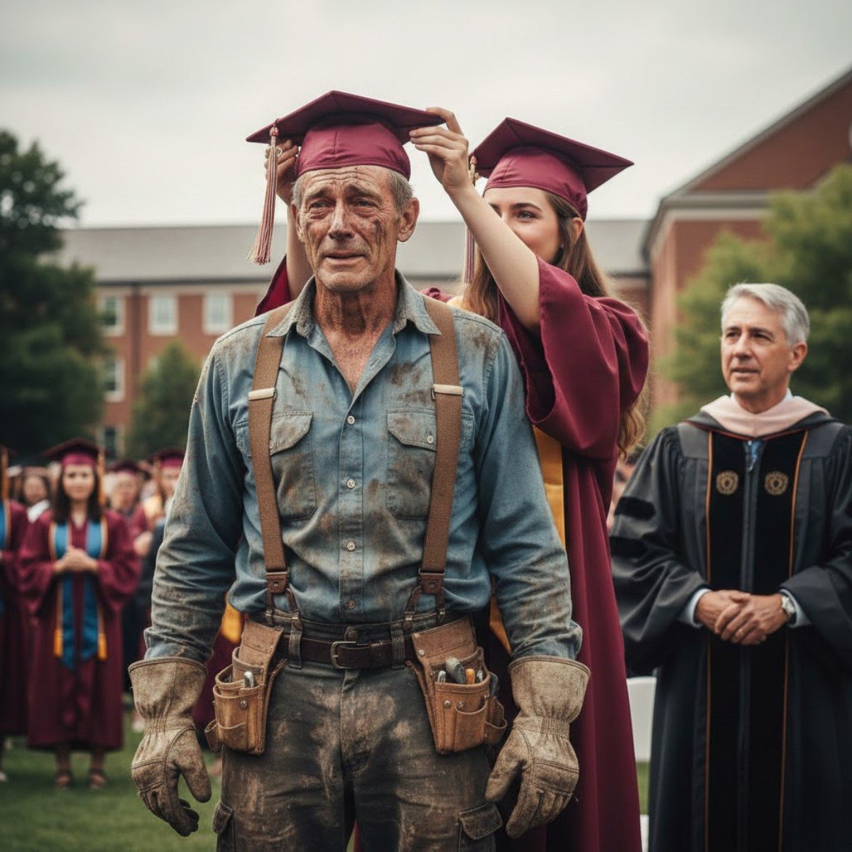 The auditorium fell into absolute silence, and all the academics, students, and attendees turned their gazes toward the tired but proud bricklayer who had raised a PhD without asking for anything in return.