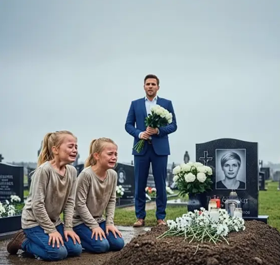 As he approached his late wife’s grave, the man stopped. In front of the headstone, directly on the wet ground, two girls were kneeling. Twin sisters. They clung to each other and sobbed uncontrollably; their hands were dirty with soil, their knees soaked, but they seemed not to notice.