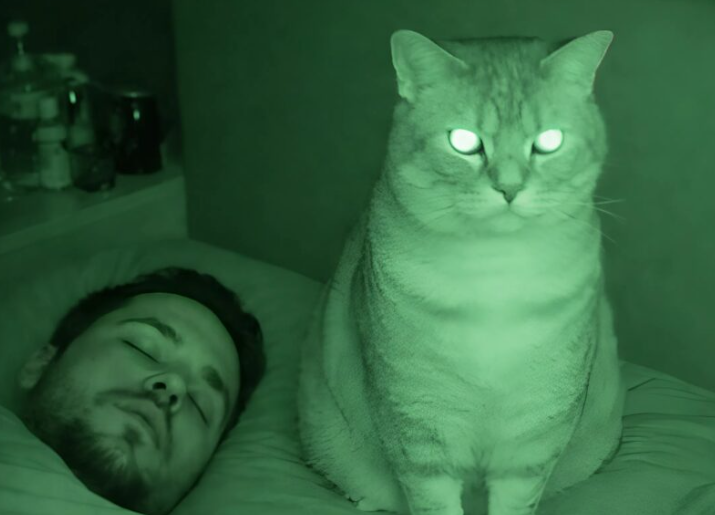 But how can you observe a cat at night if you’re asleep? I had no other choice, so I installed a night-vision camera in the bedroom, pointing it directly at our bed.