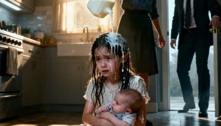 Emily était accroupie sur le carrelage, du lait coulant dans ses cheveux, sa robe trempée, des flaques s’étendant autour de ses genoux. Elle serrait Alex contre sa poitrine, le petit visage enfoui dans son épaule. Debout au-dessus d’eux, le visage tordu par la colère, se tenait Vanessa — tenant le bidon de lait vide comme une arme.