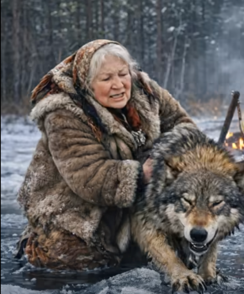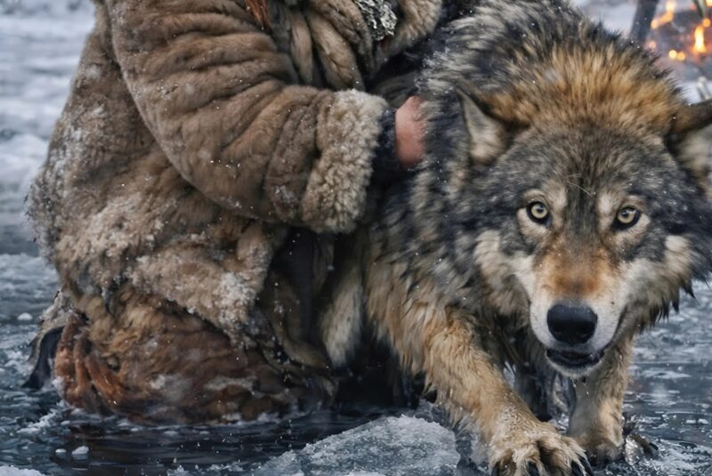 At first, the wolf bared his teeth, but he had no strength left for aggression. He grabbed the branch with his front paws. The woman pulled. Her hands trembled, her back ached, but she did not let go. The ice cracked again, water splashed over the edge, and finally the wolf’s heavy body ended up on the surface.