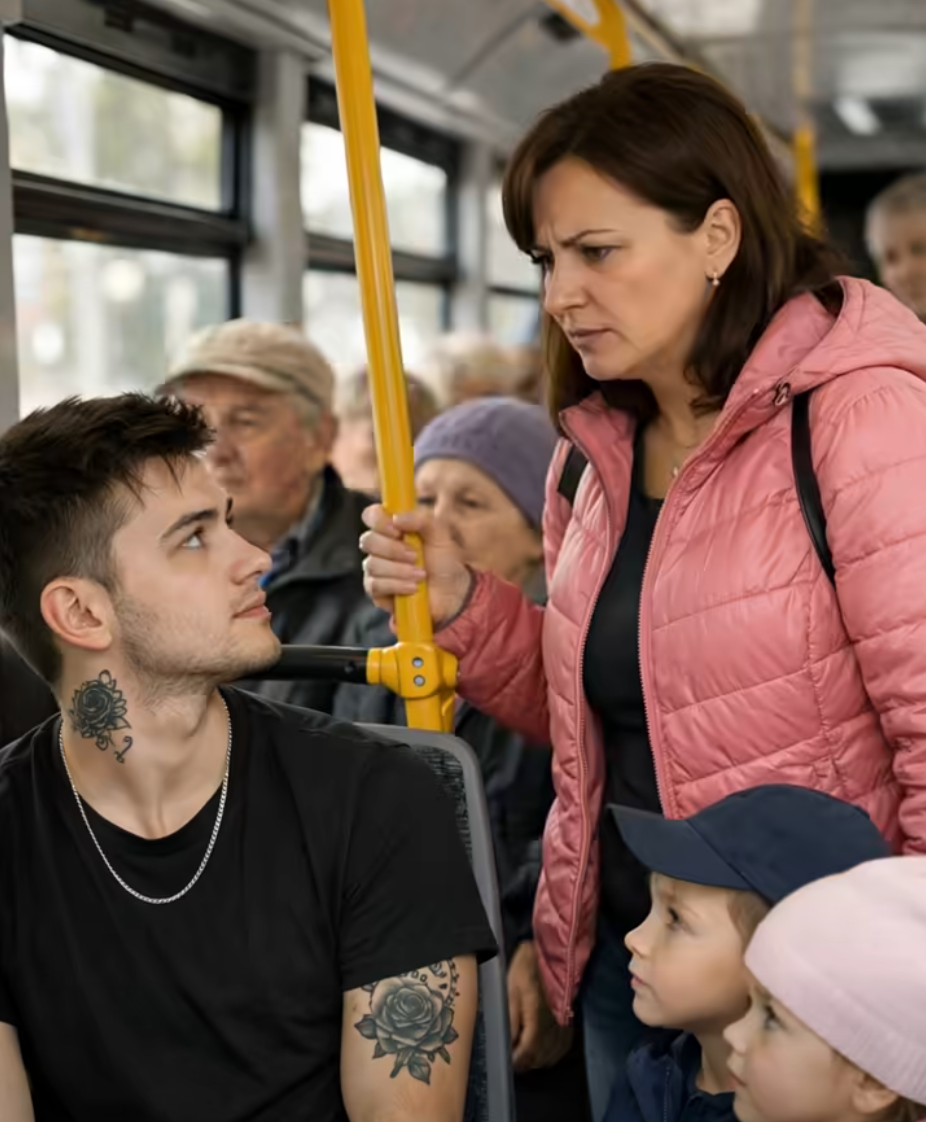At the next stop, a mother boarded with two small children. One child was holding her hand, the other was pressed against her side. There were no free seats. The woman looked around and immediately fixed her gaze on the young man. She approached him and said loudly, without hiding her irritation: