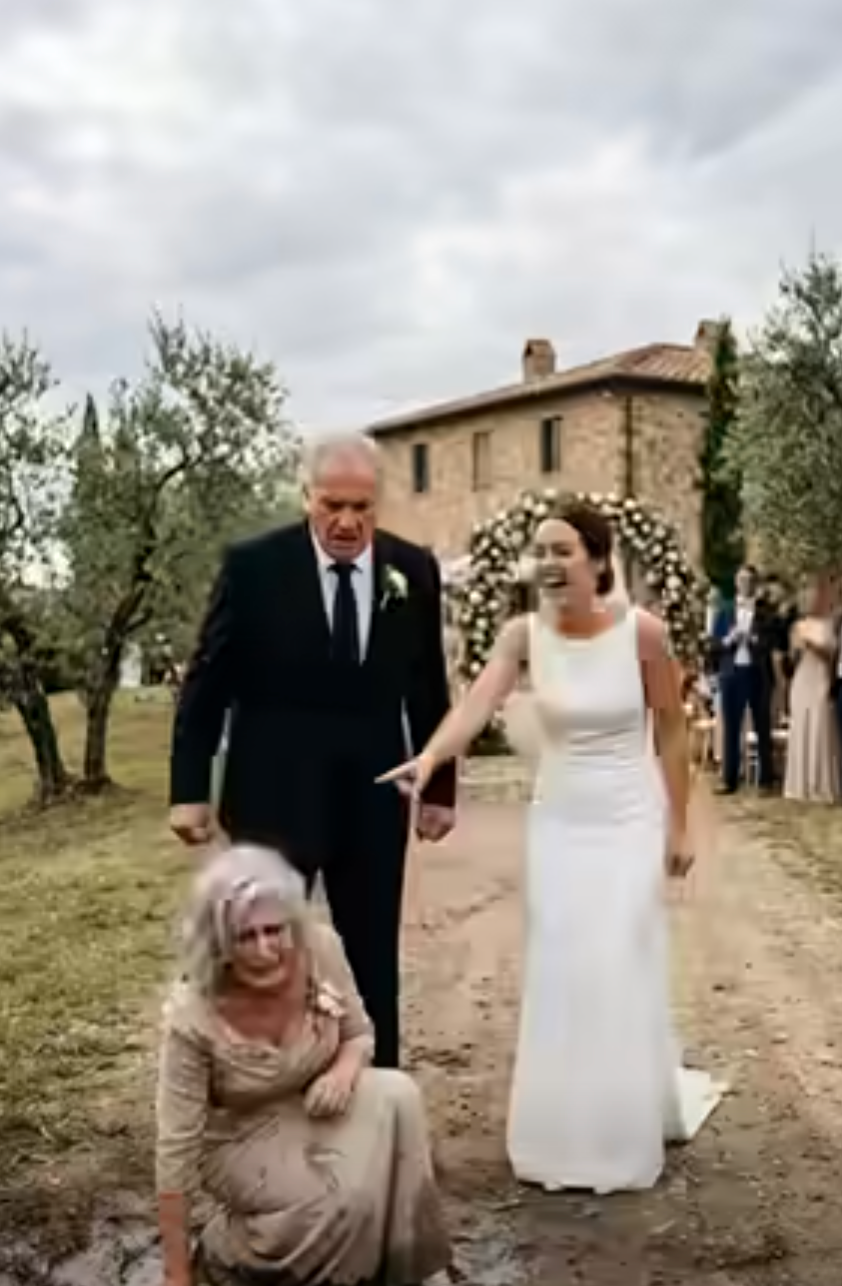 Elena lost her footing. She stumbled back, her heel catching in the soft earth, and she fell hard into the rain-soaked flowerbed beside the path. The mud was unforgiving. It splashed instantly across her lavender skirt, turning the delicate fabric into a heavy, dark ruin.