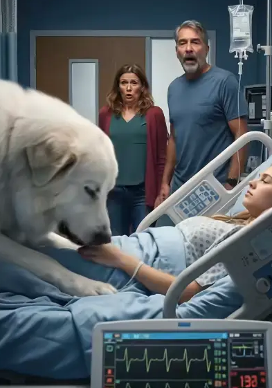Suddenly, the door to the room burst open with a loud crack. A massive, white blur shot inside. It was Thunder. He scrambled to the bedside, whining and licking Anna’s still hand, his whole body trembling with joyous recognition. Peter and Olivia stood frozen, stunned by the impossible sight.