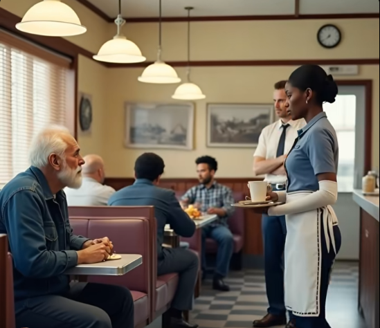 The air was saturated with the lingering smell of burnt coffee and fried bacon, a fragrance that seemed to be absorbed into the walls of the place. In the heart of this chaos, Denise stood there, carrying trays with only one arm, the other immobilized, fractured, silently suffering. Every movement of her left hand made her wince, but she forced a smile, delivering steaming coffees and plates as if everything was fine. 😲