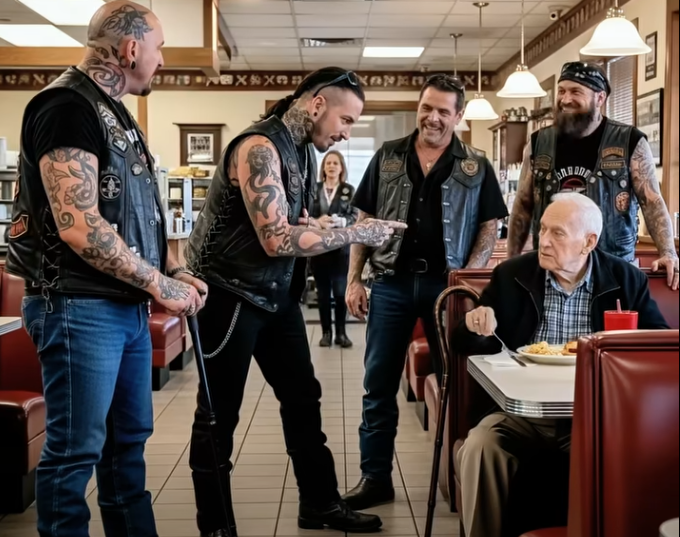 Five burly bikers stomped in, their boots echoing against the tile floor. Leather jackets, tattoos, loud laughter — the air changed instantly. They took up half the diner, scaring off a few regulars who slipped out quietly.