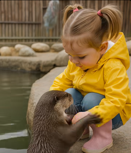 The girl crouched down and began to stroke its wet fur. The otter didn’t run away — on the contrary, it pressed against her knee, touched her hands, and twitched its whiskers as if sniffing her.