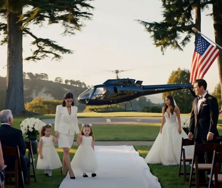 The woman in white walked down the aisle with the confidence of someone who once belonged there — because she had. She stopped where rose petals blended into the carpet, the American flag on the veranda fluttering in the afternoon heat, and the silence of three hundred held breaths made room for one voice.