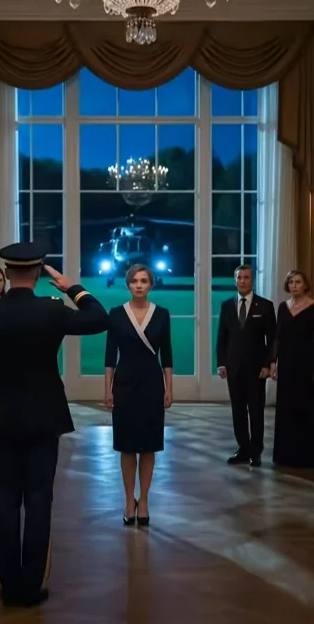 Outside the grand ballroom, the sky cracked open with the wump-wump-wump of helicopter blades. It wasn’t subtle. Lights from the windows flickered as a matte-black military chopper descended over the lawn. Stealth-painted. Floodlights flaring. Rotors churning the air like a storm.